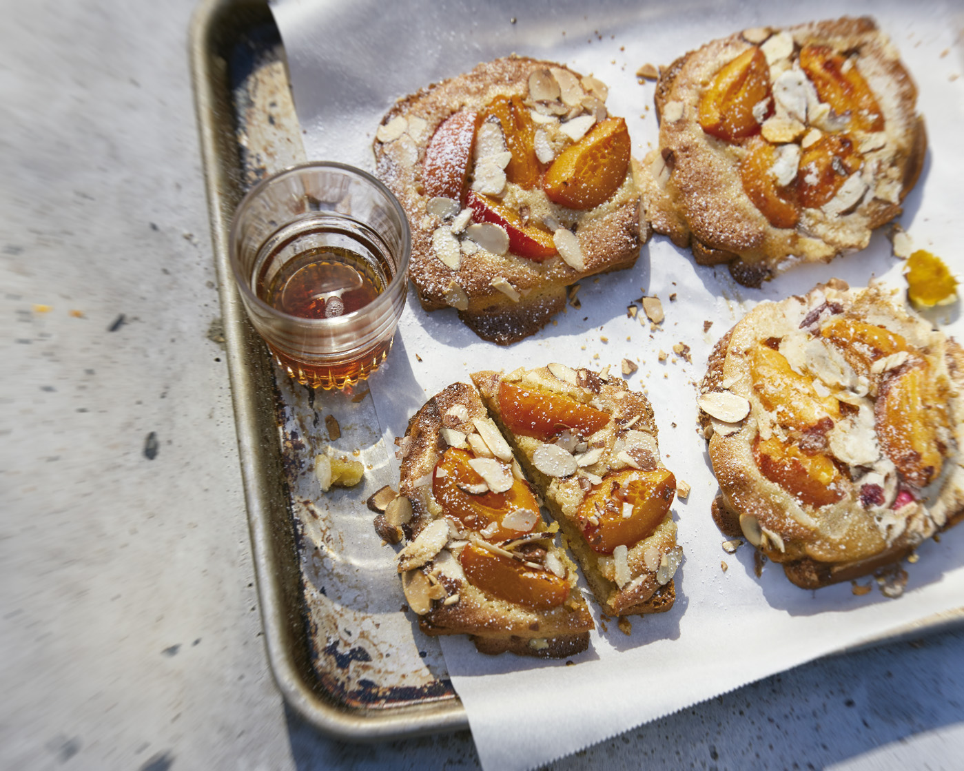 [2] Coloca las rebanadas de brioche en una bandeja. Píntalas por encima con una cantidad generosa de la mezcla de sirope de arce. Con cuidado, unta un cuarto de taza de frangipane sobre cada rebanada, procurando no rasgar demasiado la miga. Coloca encima los gajos de albaricoque, aplastándolos contra el frangipane. Adorna con las almendras laminadas.